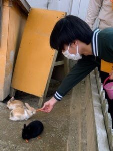 ウサギにニンジンをあげたときはカラダを撫でて「フワフワ」と言っていました。